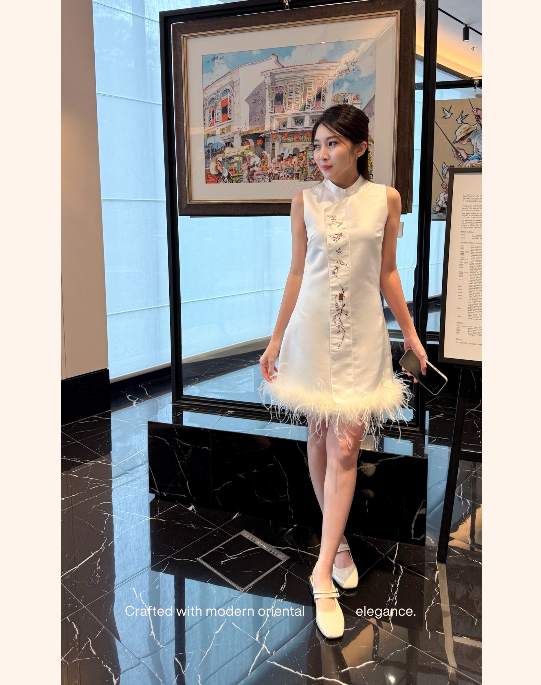 【霜华映羽】 高定系列 Frosted Grace Feather Qipao 珍珠羽裳缎面新中式旗袍连衣裙 (DRESS Only)