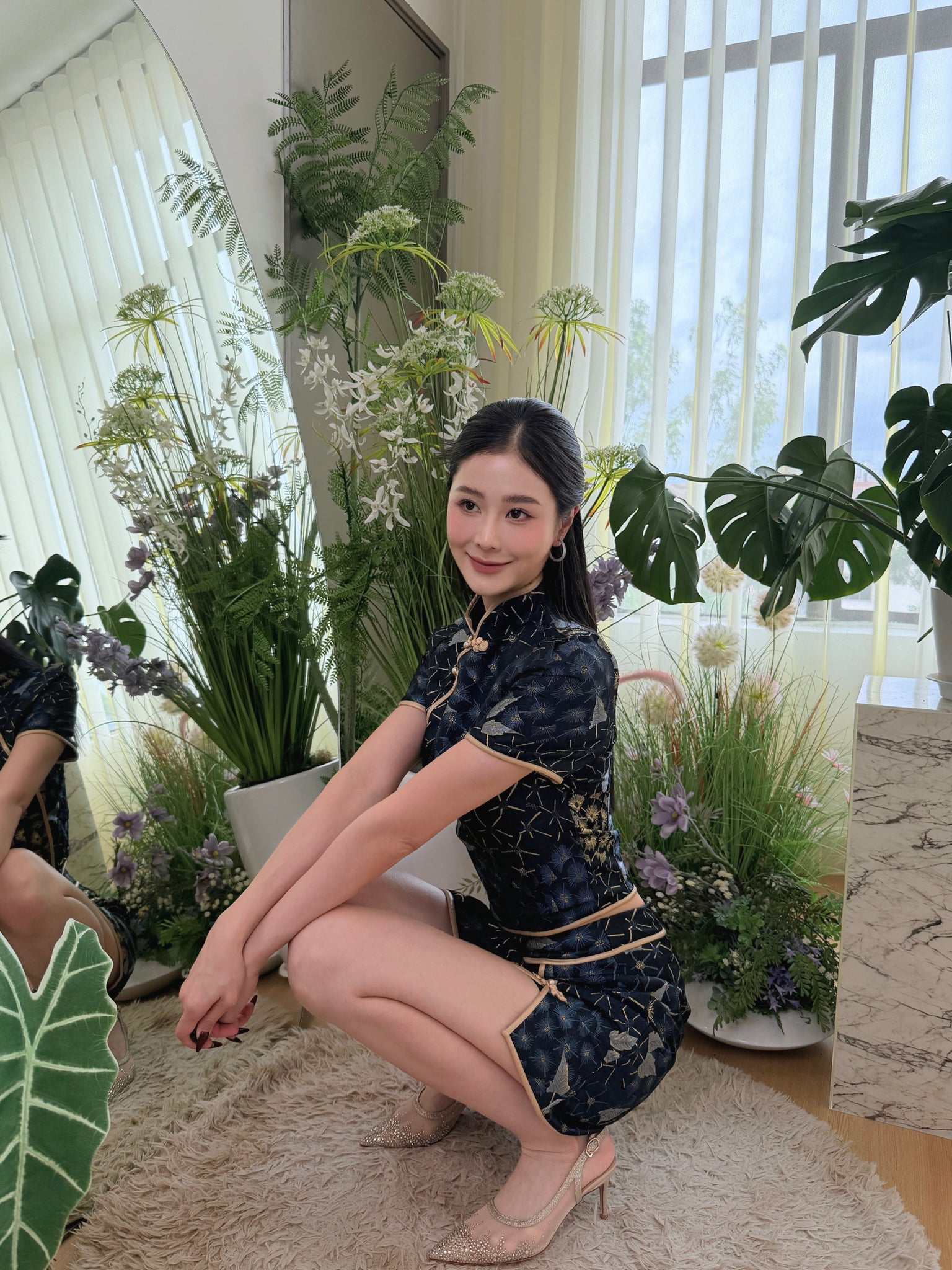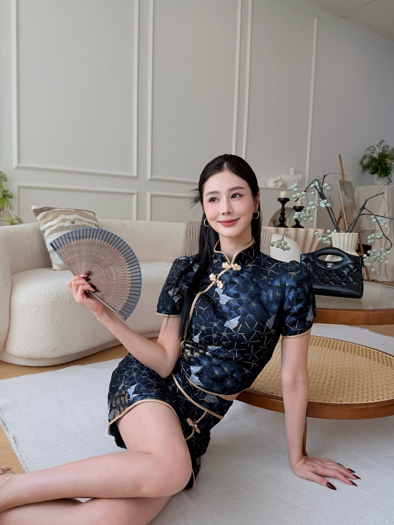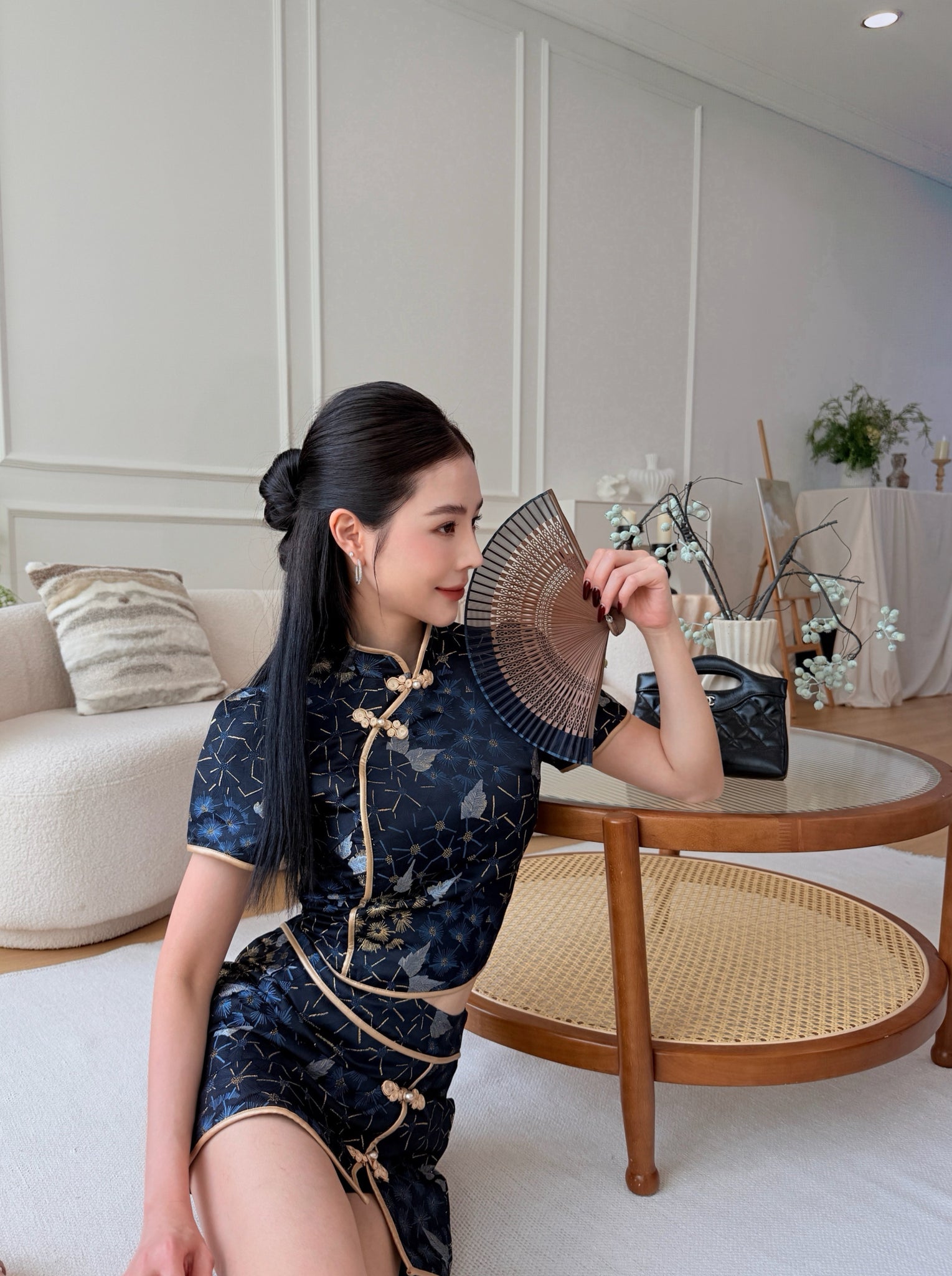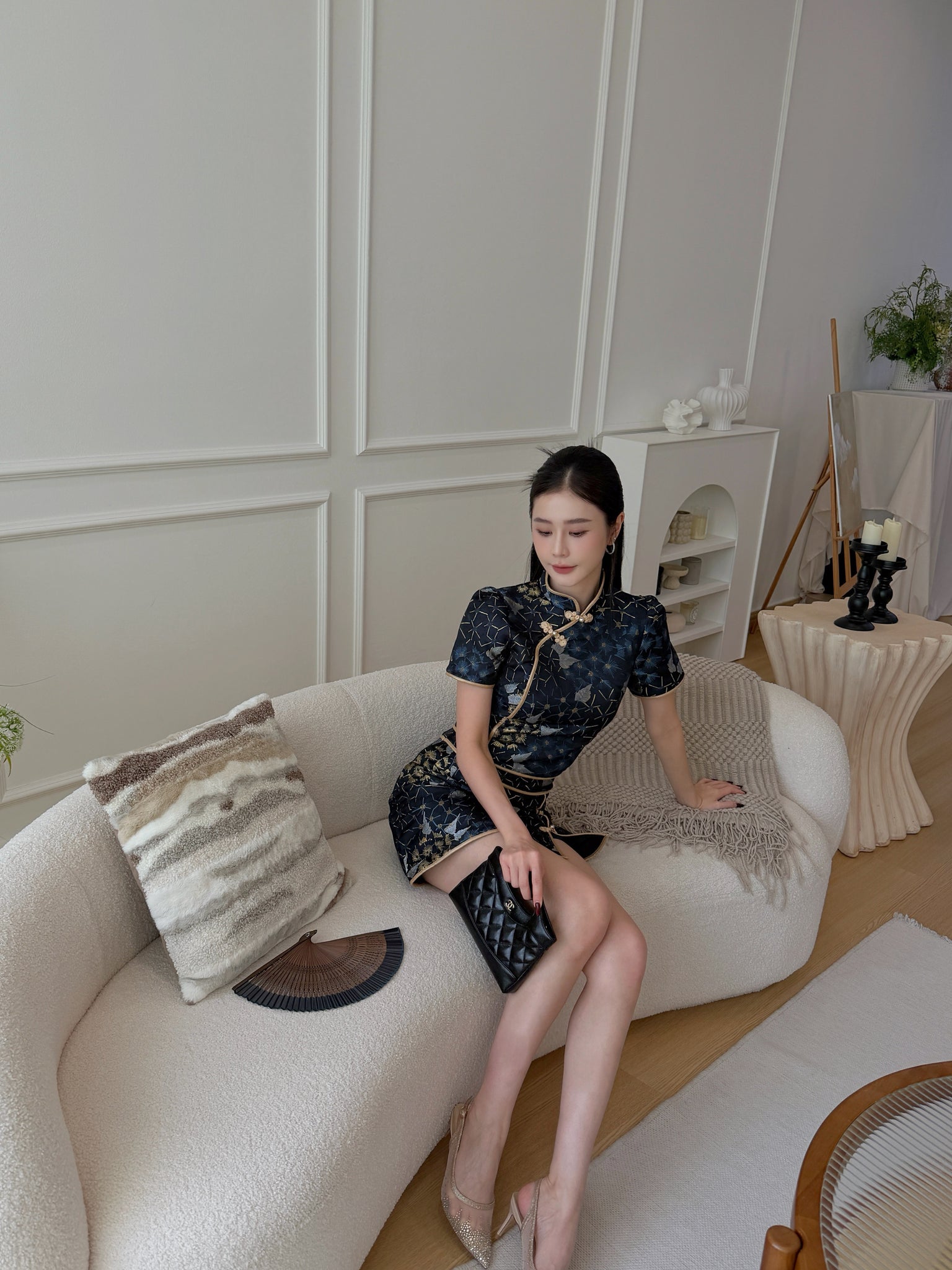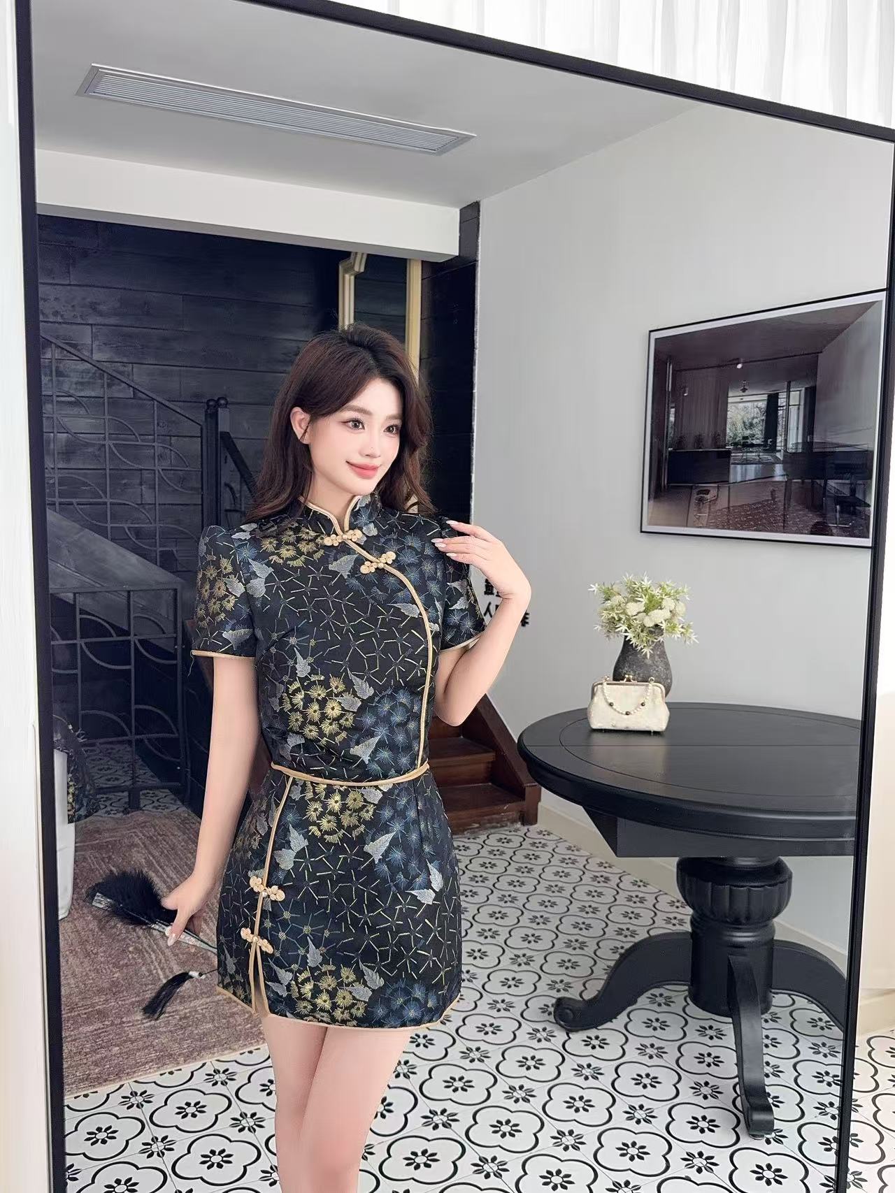 辅以 定制金色盘扣 与挺版立领剪裁,
