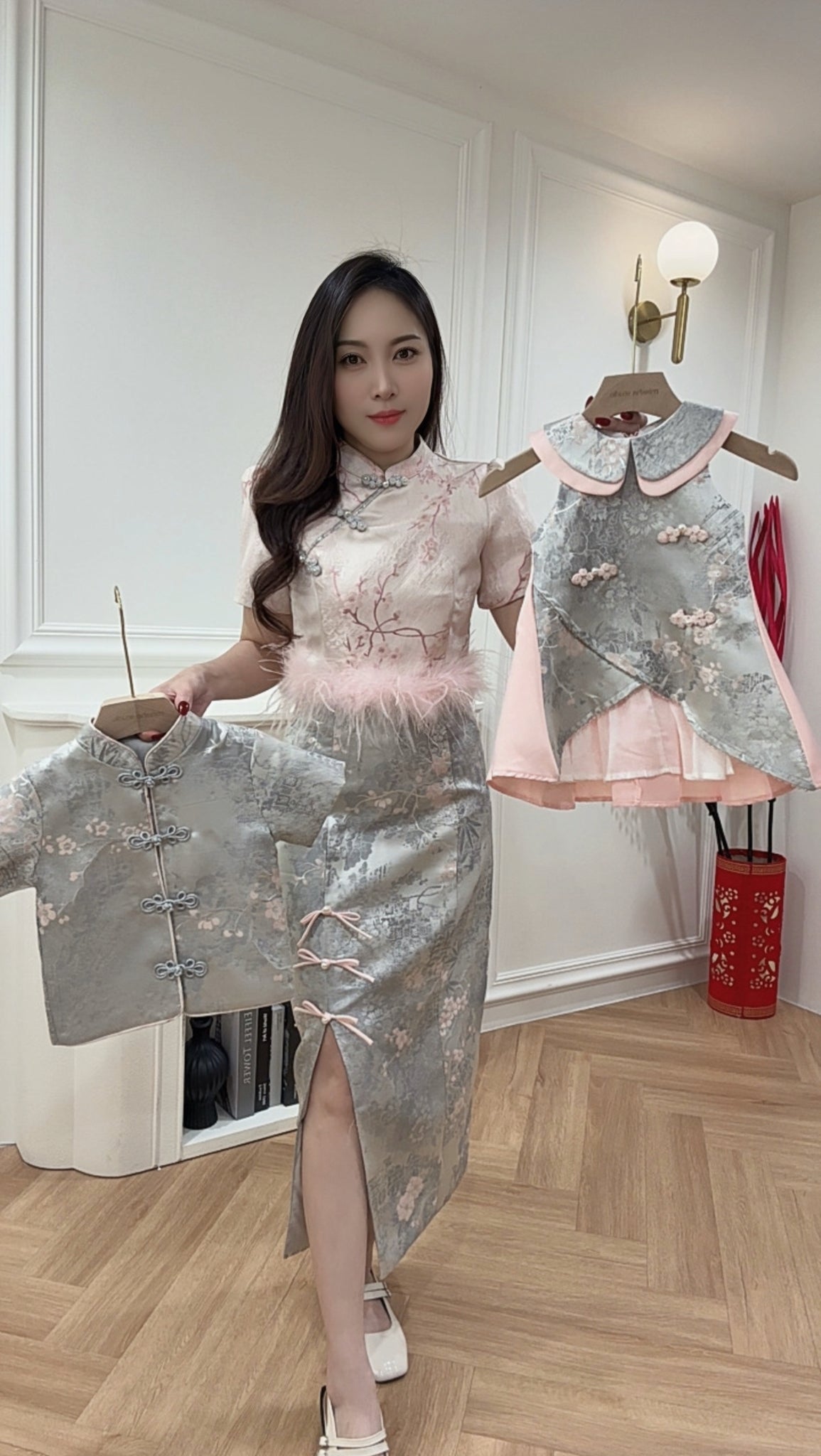 【梅影春柔】以淡雅梅花纹样为灵感,将传统中式元素,化为适合一家人共同穿着的温柔高定系列。