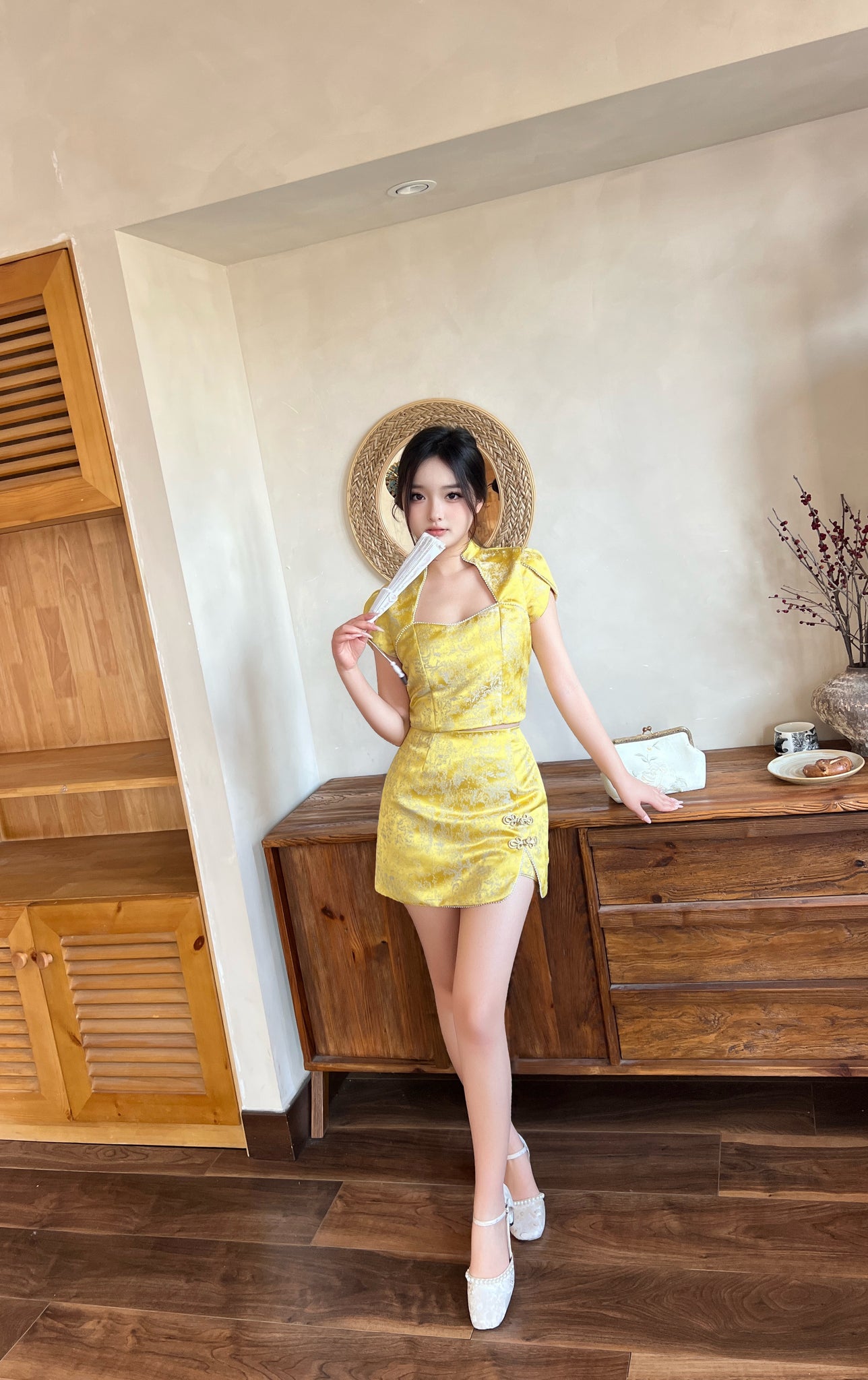 领口、袖口与裙摆皆点缀迷你珍珠装饰,细节精致而不张扬,为整体造型增添轻奢层次感。裙侧搭配金丝盘扣设计,呼应传统中式元素,同时强化视觉焦点,使造型更显完整与高级。