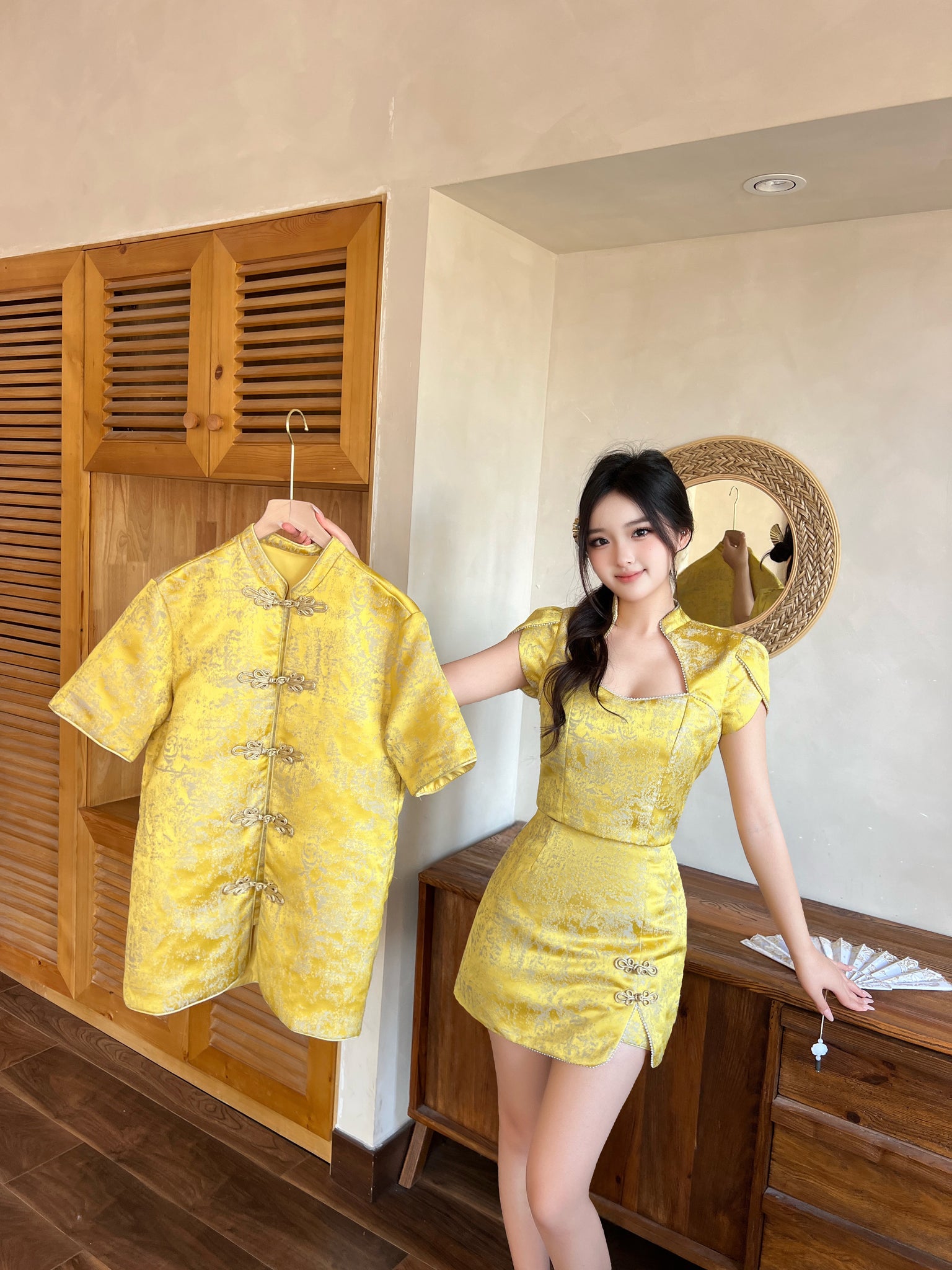 女装选用金色提花锦缎面料,光泽柔和细腻,在光线流转间展现优雅贵气。整体以修身剪裁勾勒身形比例,展现东方女性的柔美线条。