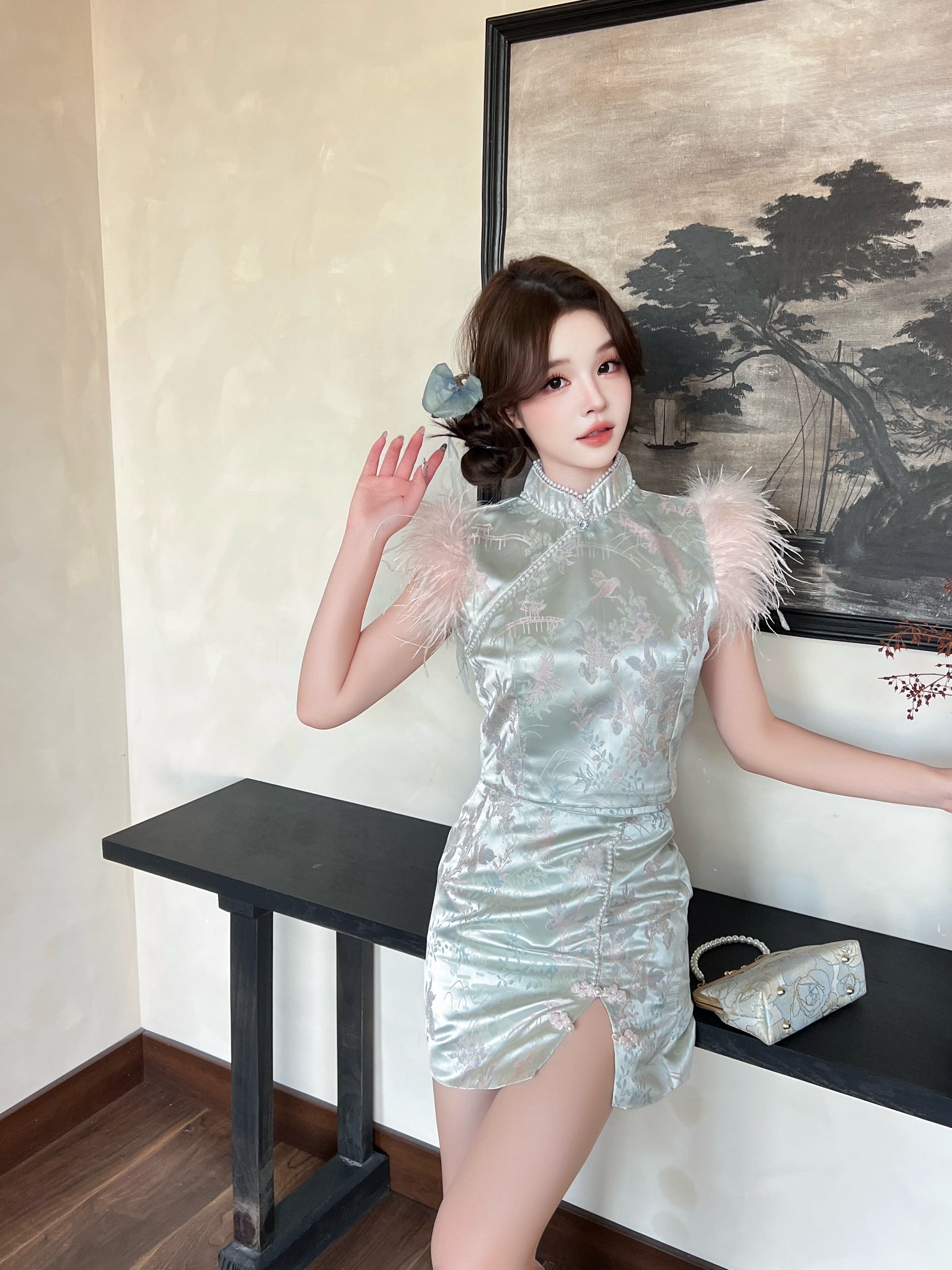 肩部点缀粉色鸵鸟毛袖,轻盈立体,营造柔美轮廓。