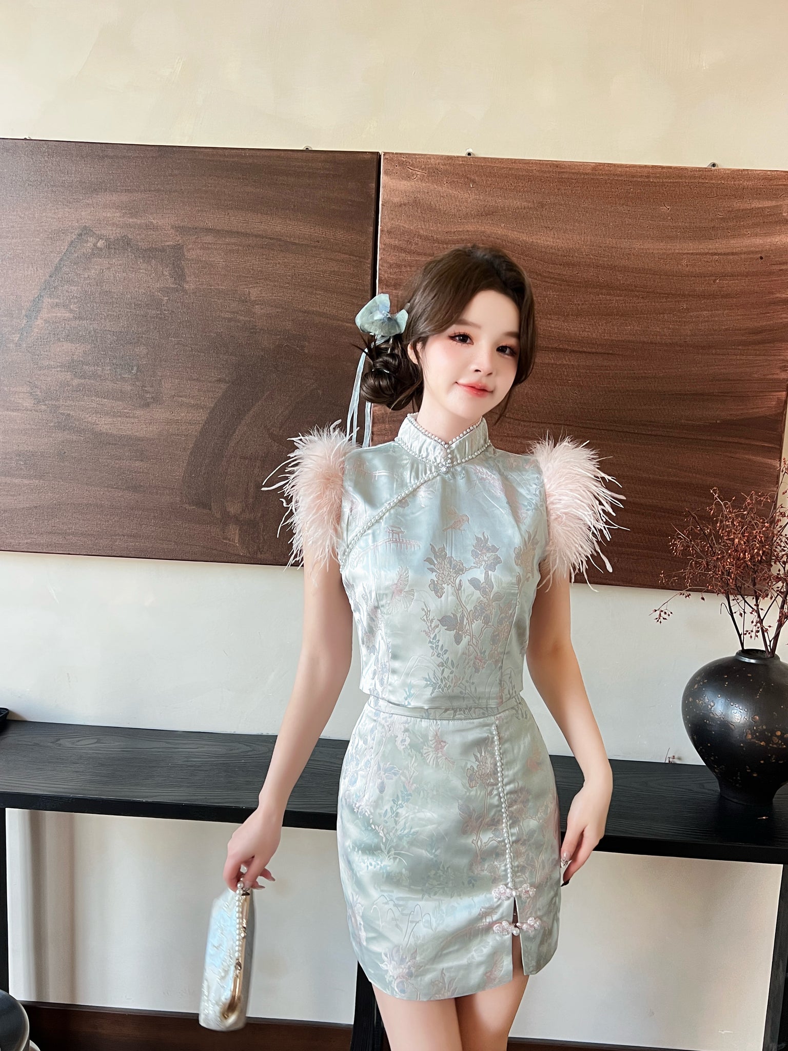 以温柔梦幻的银粉色锦缎为主调,融合东方旗袍结构与现代剪裁,