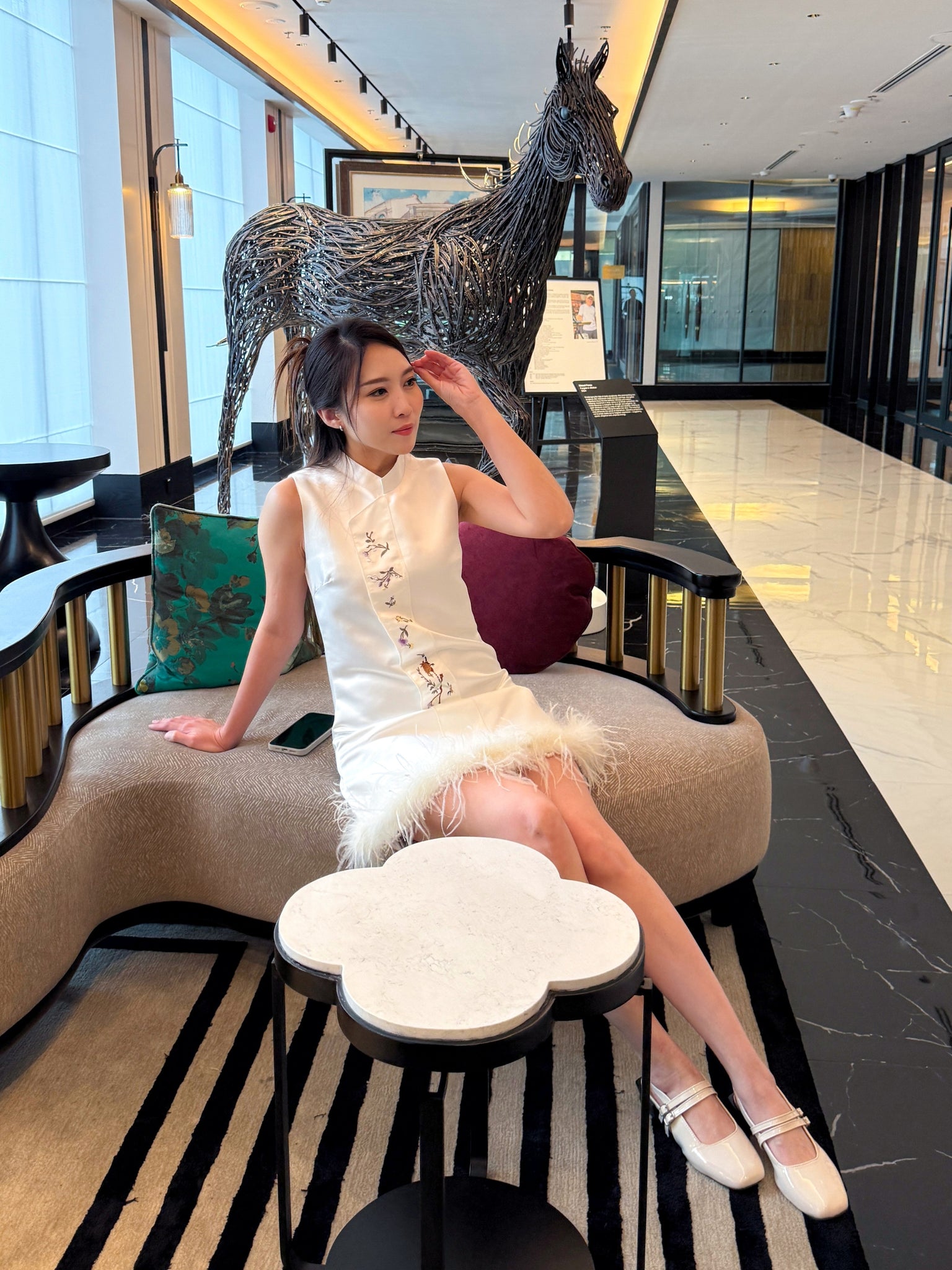 • 可拆卸鸵鸟羽饰 — 自由切换场合造型,轻盈不失贵气。
