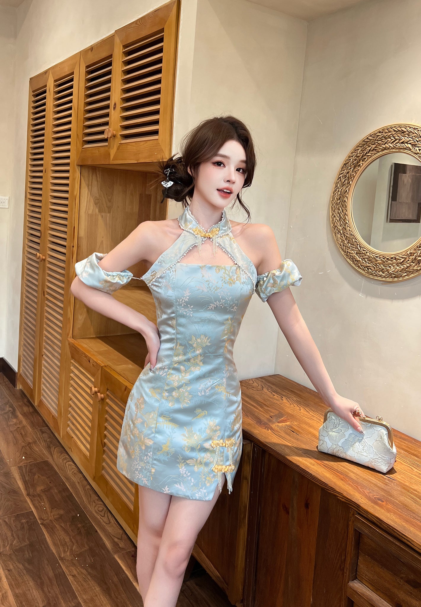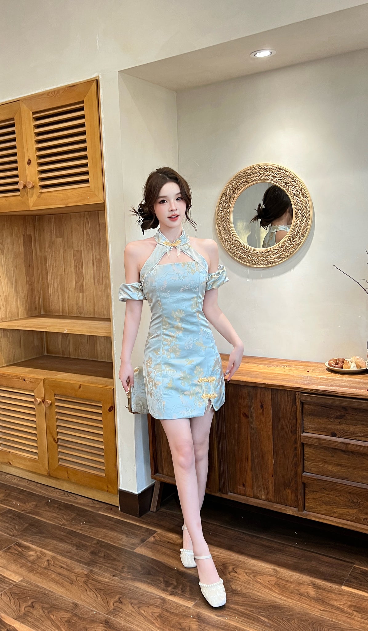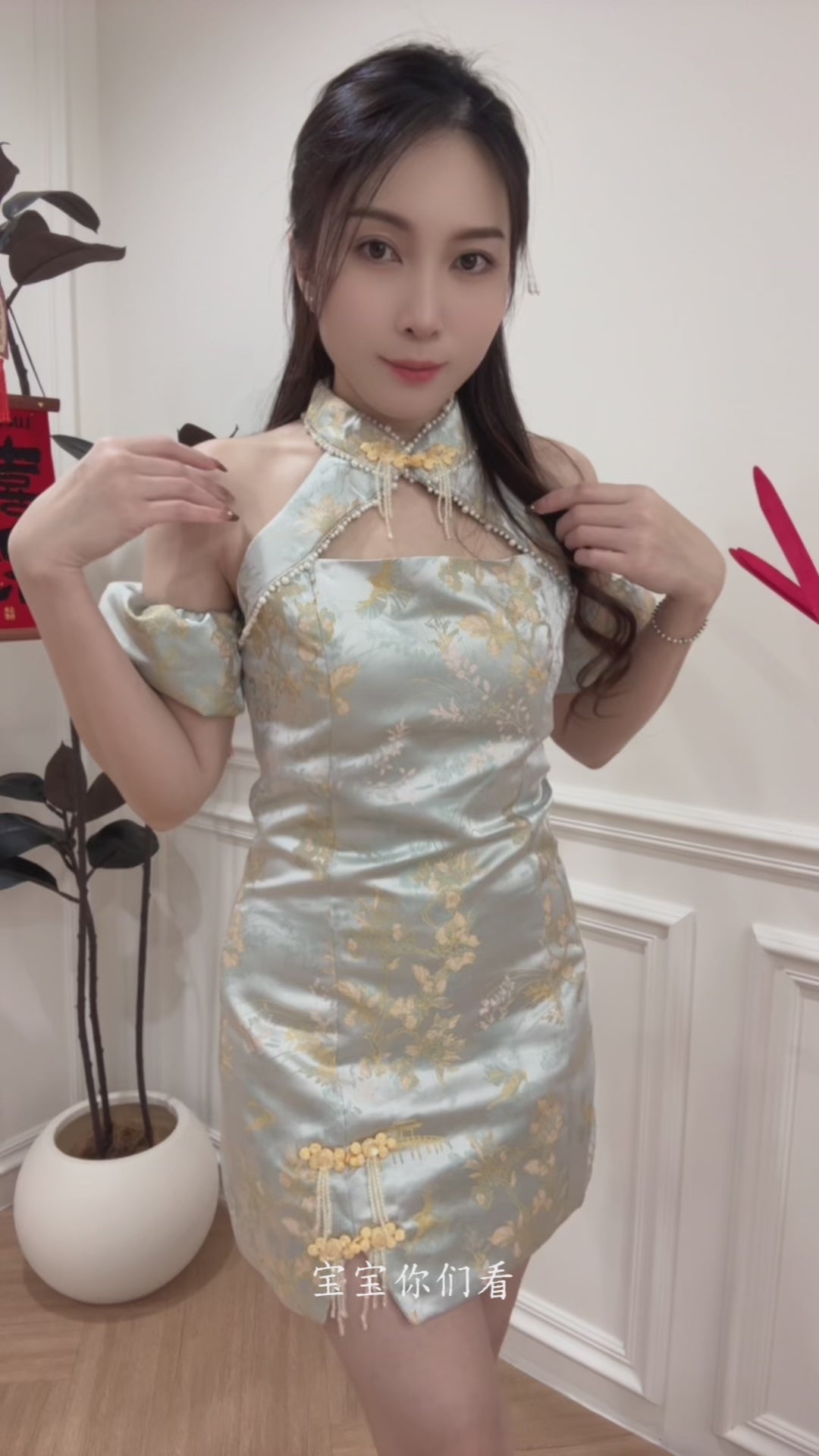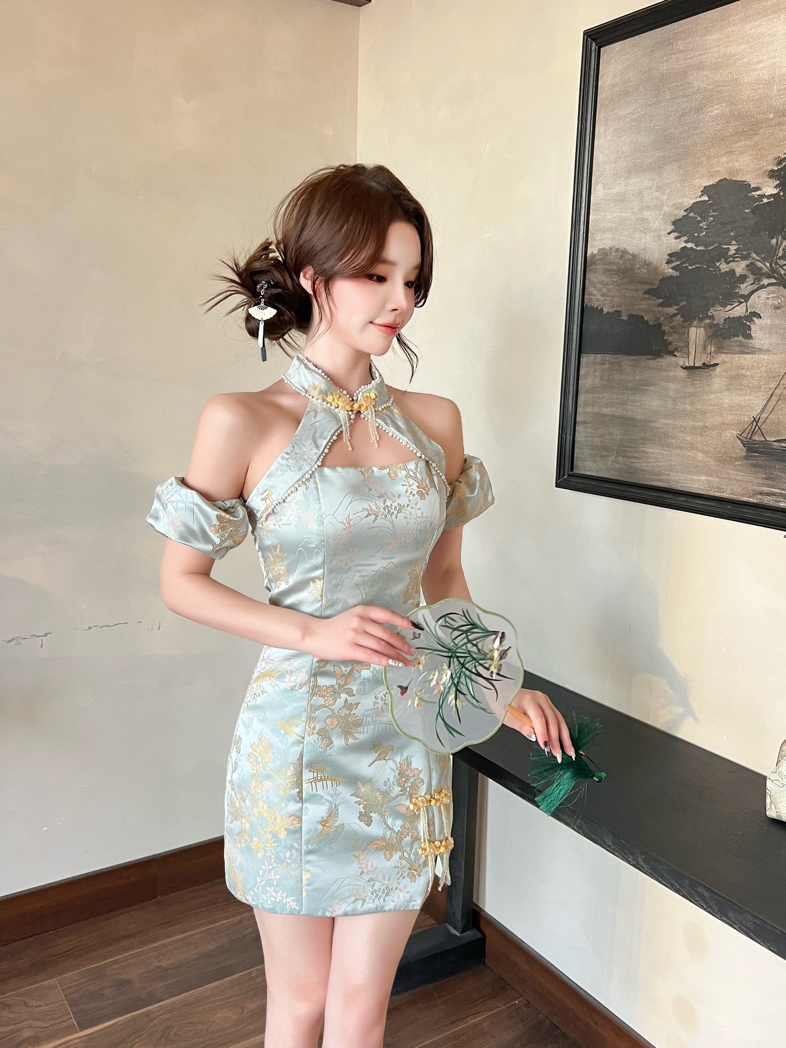 裙身为修身短款剪裁,侧边盘扣细节呼应整体设计,