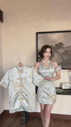 女装选用青玉色 × 金色「春山盛」高级缎面提花,